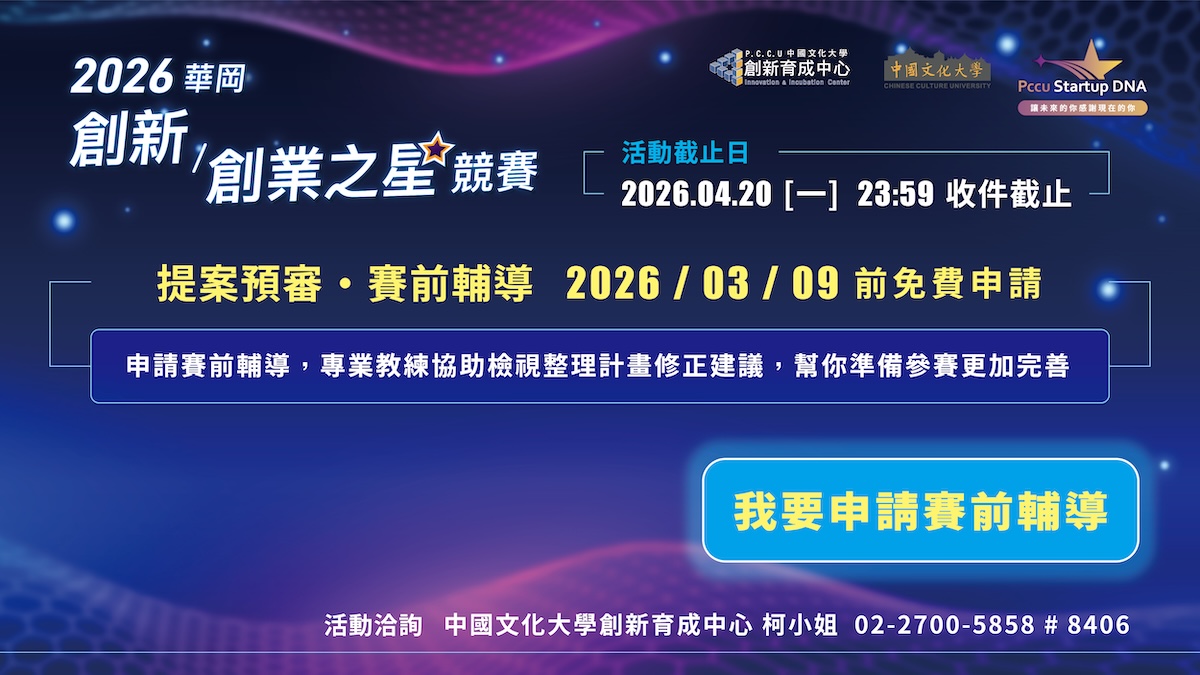 🚀 活動洽詢: 中國文化大學 創新育成中心 (信箱:ycko@sce.pccu.edu.tw /電話:(02)2700-5858分機8406)