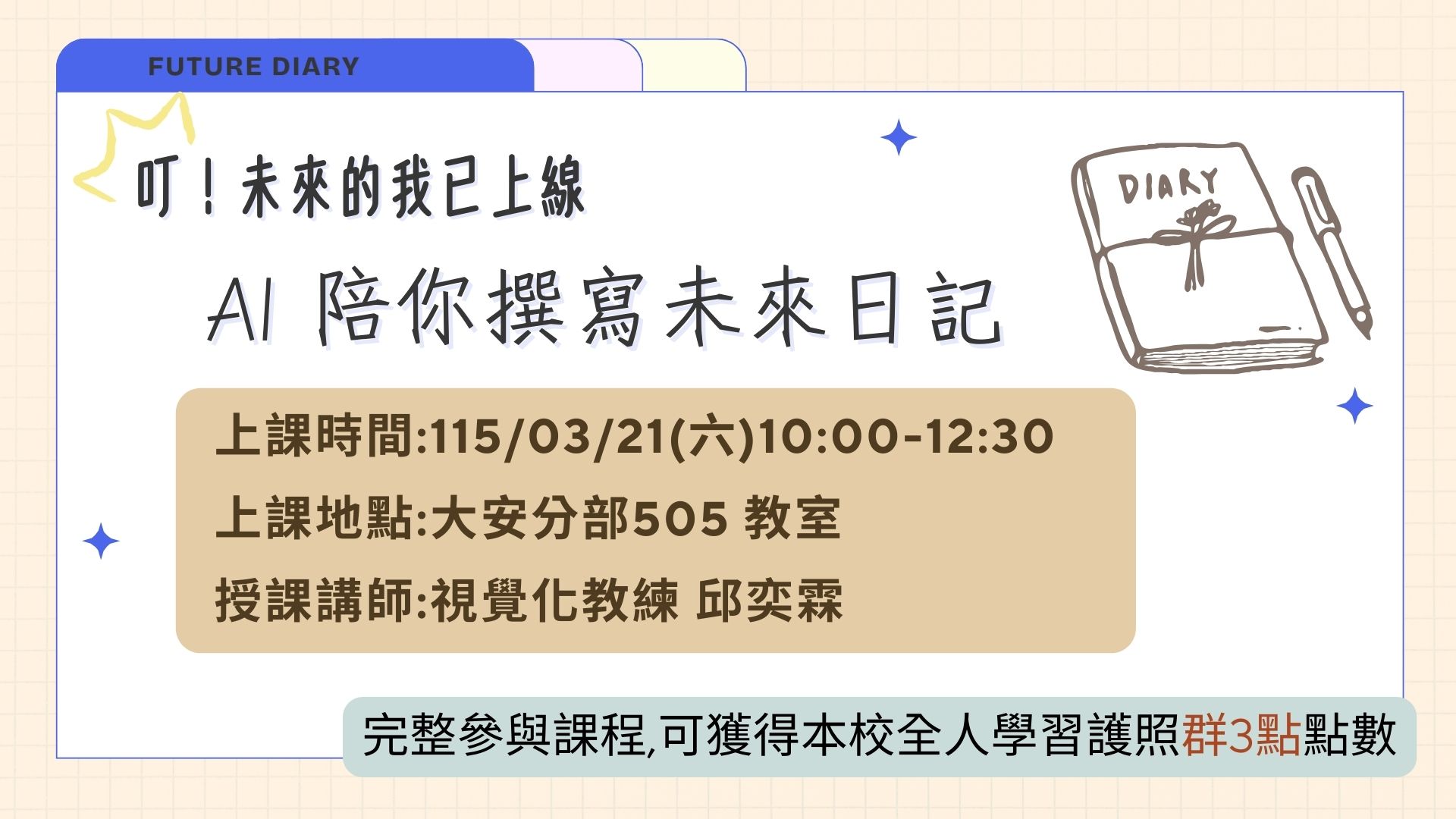 114華岡創新創業系列課程 05:2026/03/21 (六) 10:00-12:30 《叮!未來的我已上線:AI 陪你撰寫未來日記》